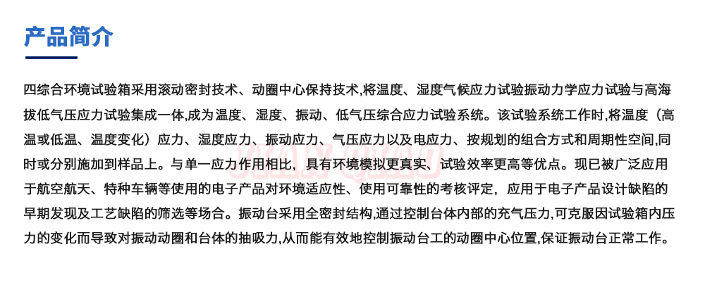 用途:四綜合環(huán)境試驗箱采用滾動密封技術、動圈中心保持技術,將溫度、濕度氣候應力試驗振動力學應力試驗與高海拔低氣壓應力試驗集成一體,成為溫度、濕度、振動、低氣壓綜合應力試驗系
