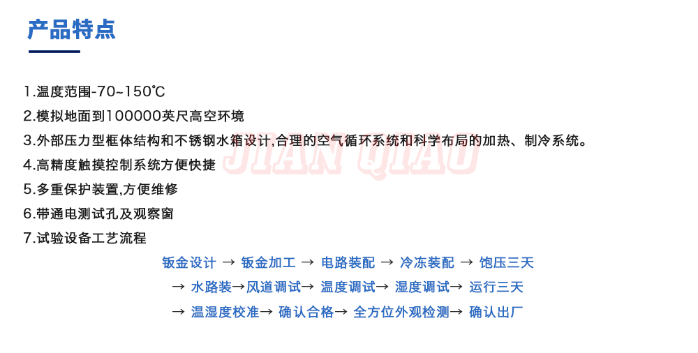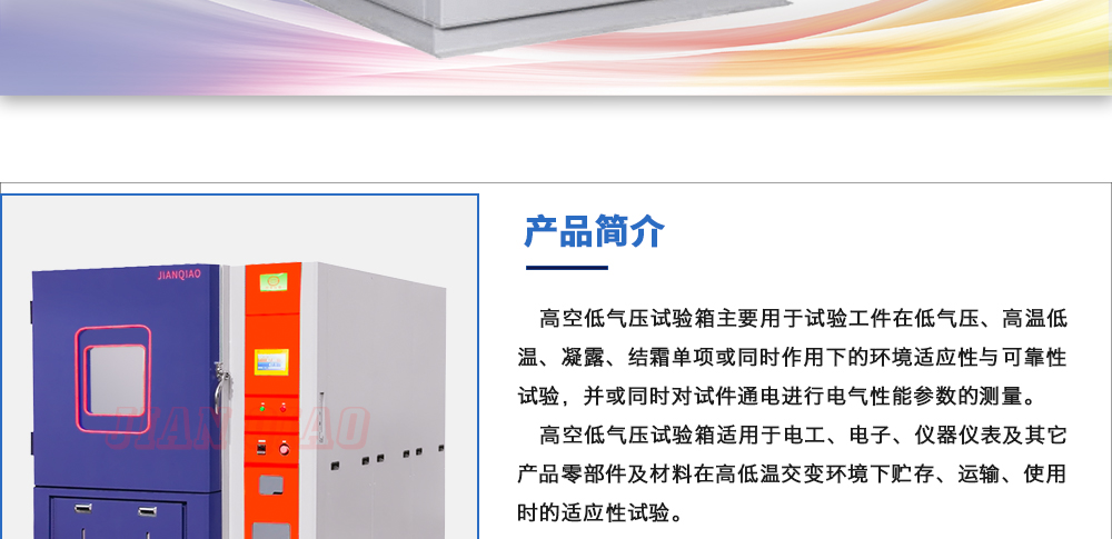 用途:高低溫低氣壓試驗箱主要用于試驗工件在低氣壓、高溫低溫單項或同時作用下的環(huán)境適應(yīng)性與可靠性試驗,并或同時對試件通電進行電氣性能參數(shù)的測量。