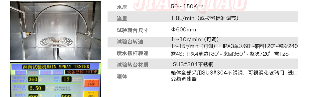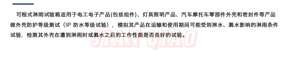 用途:可程式淋雨試驗(yàn)箱適用于電工電子產(chǎn)品(包括組件)、燈具照明產(chǎn)品、汽車摩托車零部件外殼和密封件等產(chǎn)品做外殼防護(hù)等級測試(IP 防水等級試驗(yàn)),模擬其產(chǎn)品在運(yùn)輸和使用期間可能受