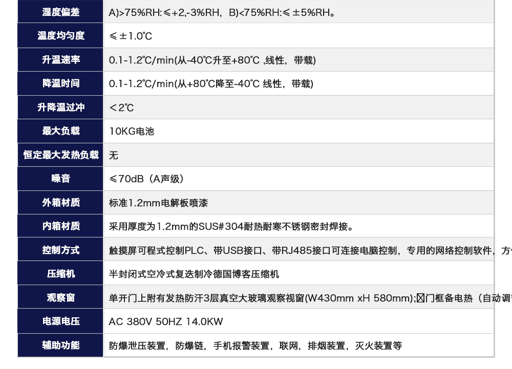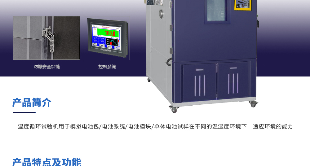 用途:溫度循環(huán)試驗機用于模擬電池包/電池系統(tǒng)/電池模塊/單體電池試樣在不同的溫濕度環(huán)境下,適應環(huán)境的能力