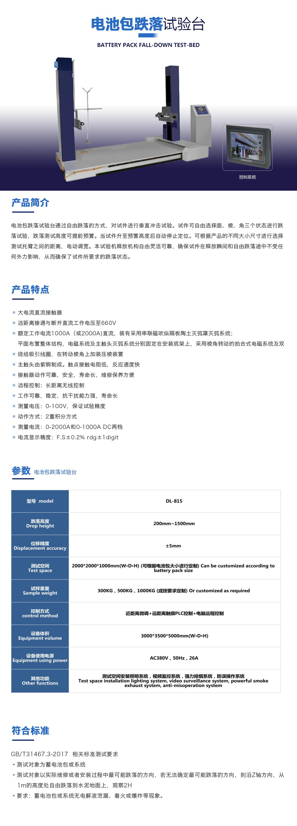 用途:電池包跌落試驗(yàn)臺(tái)通過自由跌落的方式,對(duì)試件進(jìn)行垂直沖擊試驗(yàn)。試件可自由選擇面、棱、角三個(gè)狀態(tài)進(jìn)行跌落試驗(yàn),跌落測(cè)試高度可提前預(yù)置。當(dāng)試件升至預(yù)置高度后自動(dòng)停止定位