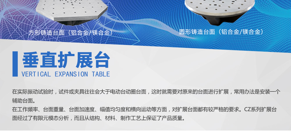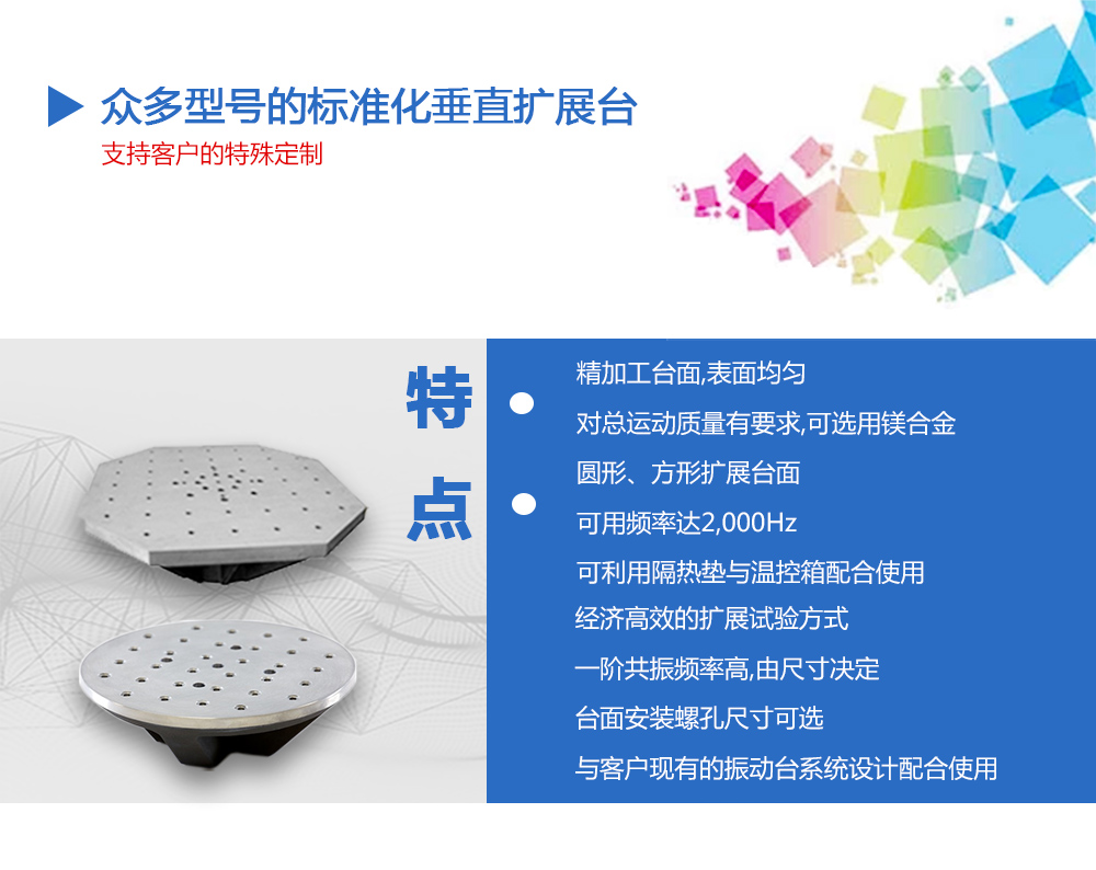 用途:供應(yīng)眾多型號的標(biāo)準(zhǔn)化垂直水平擴(kuò)展臺,而且支持客戶的特殊定制,從而滿足客戶對振動臺性能擴(kuò)展的需求。在實際振動試驗時,試件或夾具往往會大于電動臺動圈臺面,這時就需要對